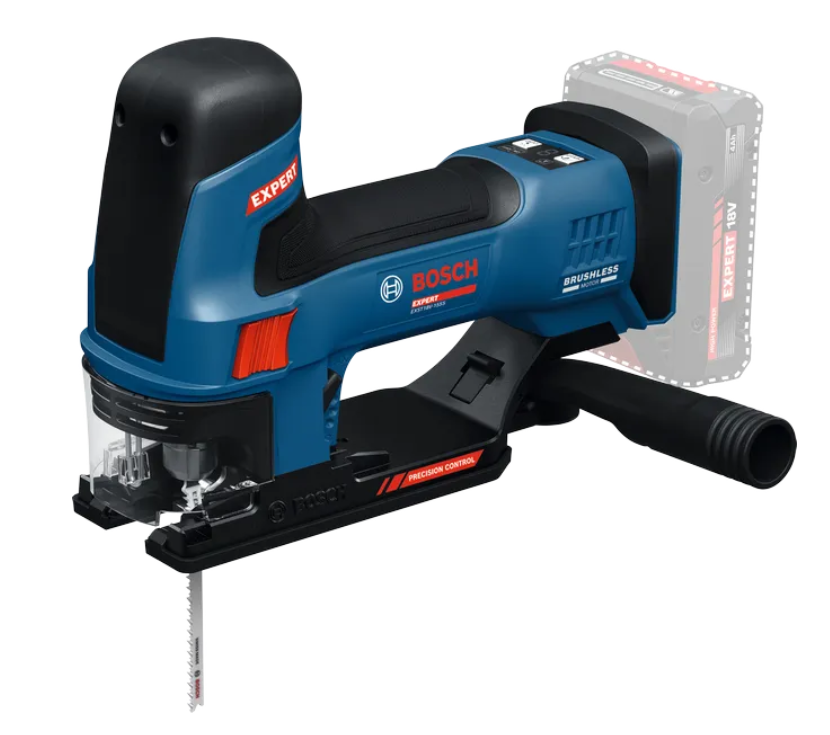 Die 18V-Stichsäge EXPERT EXST18V-155S mit Stabgriff bietet höchste Genauigkeit. Ihre Sägeblattführung verhindert das Verlaufen des Sägeblatts, auch bei kleinen Kurven, und liefert höchste Genauigkeit. Das intuitive, ergonomische Design bietet eine 360°-Greifmöglichkeit und gewährleistet so hervorragende Werkzeugkontrolle – selbst beim Sägen von unten. Die Stichsäge bietet fortschrittlichen Anwenderschutz: Drop Control minimiert das Verletzungsrisiko durch die unverzügliche Abschaltung des Werkzeugs, wenn es herunterfällt. Sie besitzt eine zuverlässige Staubabsaugung mit einfach zu befestigenden Gelenkadaptern für die flexible Positionierung des Saugschlauchs und einen gut zugänglichen Ein/Aus-Schalter für beste Ergebnisse. Dank der komfortablen Ergonomie kann der beidseitige Schalter zum Ver- und Entriegeln einfach erreicht und die Geschwindigkeit komfortabel und stufenlos angepasst werden. Die HMI des Werkzeugs sorgt für die einfache Bedienung der 6-stufigen Geschwindigkeitsauswahl und der LED-Leuchte und stellt gleichzeitig eine klare Anzeige des Werkzeug- und Akku-Status bereit. Die EXPERT EXST18V-155S besitzt einen Auswurfhebel für mehr Schutz und Komfort beim Wechseln der Sägeblätter. Sie eignet sich ideal für Rund- und Querschnitte in Massivholz, Spanplatten und Holzverbundwerkstoffen sowie in dickeren oder härteren Materialien.